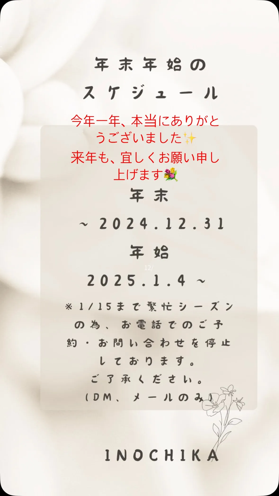昨年中は、素敵な出会いを沢山刻ませて頂き、多くの方の優しさに... 2025/01/30 昨年中は、素敵な出会いを沢山刻ませて頂き、多くの方の優しさに触れ、心から感謝しております♡本当にありがとうございました💐本年も、楽しくかけがえのない人生の節目の一コマを、イノチカでお過ごし頂…