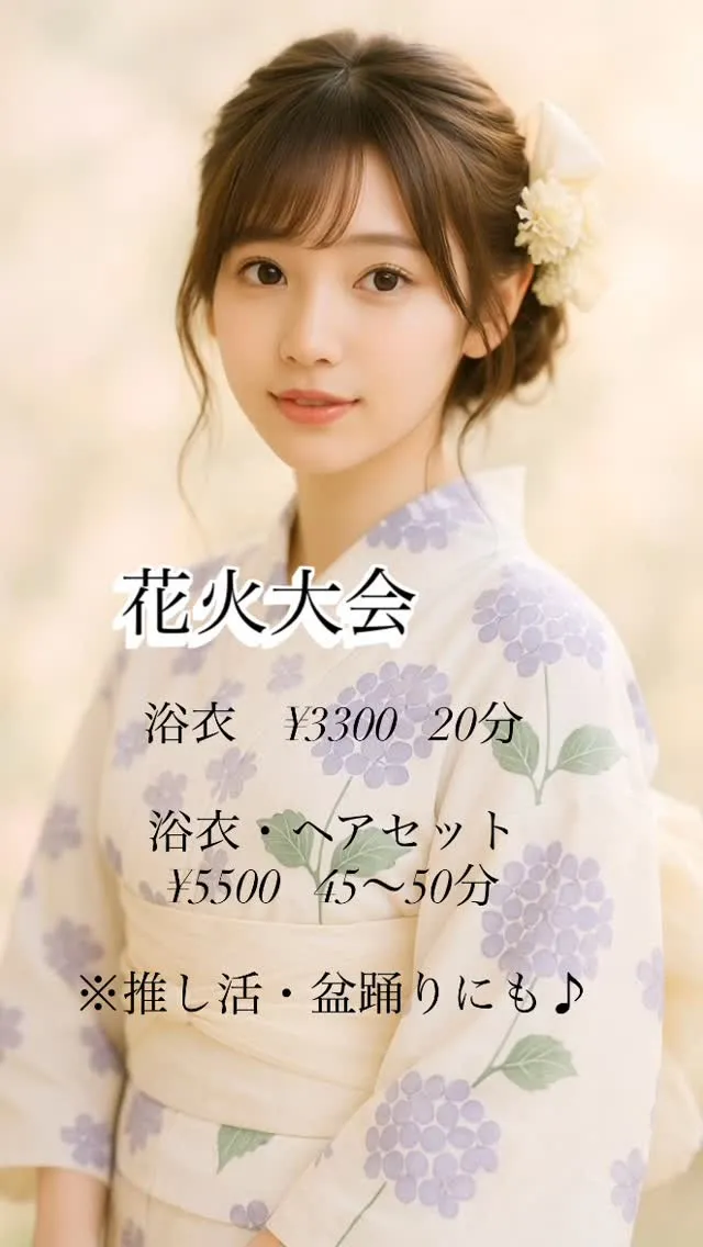 夜間出張でレンタル込みの、浴衣の団体プランも東京で行っております。夏祭りやイベントごとなどで「大人数で着たい」「着方が分からないからプロに任せたい」といった場合に、リーズナブルな金額でお楽しみいただけます。利用目的に合わせてスピーディーに対応いたしますので、お気軽にご相談ください。